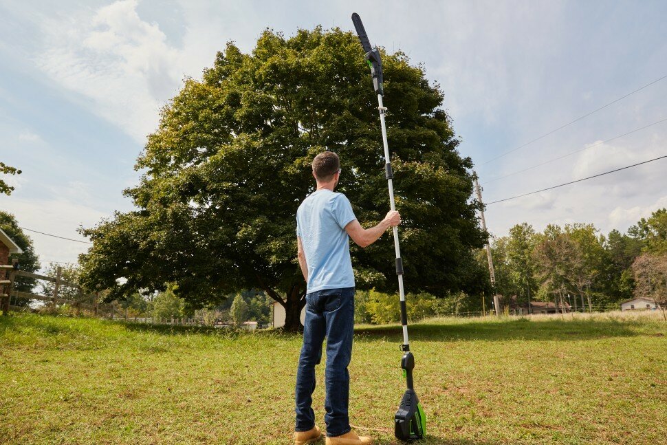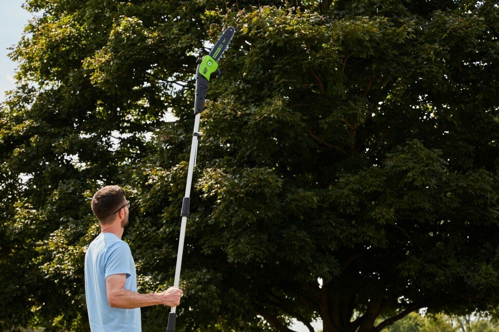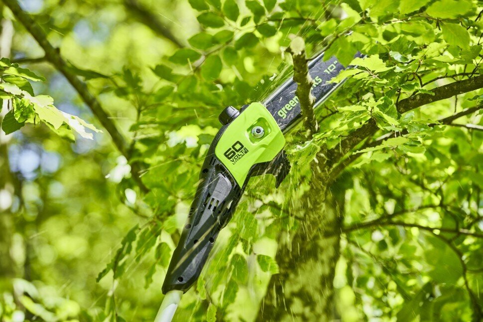 Высоторез/Сучкорез аккумуляторный Greenworks Арт. 1402107, 60V, 25 см, бесщеточный без АКБ и ЗУ — инструмент с легкостью справится с обрезкой ветвей и сучьев на высоте до 3,5 метров благодаря составной 3-секционной штанге.