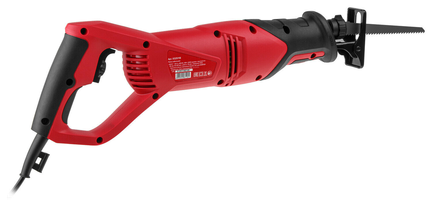 Сабельная пила 800 Вт WORTEX SR 1508-1 E 0325118 - оснащена регулировкой скорости для аккуратной резки хрупких материалов или высокоскоростного распила. Предусмотрена удобная замена пильного полотна без специального инструмента. Эргономичный дизайн корпуса, хорошая развесовка, резиновые накладки облегчают контроль инструмента, повышают комфорт во время работы и защищают от повреждений. Характеристики: Класс товара - полупрофессиональный. Мощность - 800 Вт. Крепление полотен - универсальное. Max число ходов на холостом ходу - 3300. Величина хода - 20 мм. Длина кабеля - 2 м. Глубина распила(дерево) - 150 мм. Глубина распила(металл) - 12 мм. Глубина распила (пластик) - 35 мм. Бесключевая замена оснастки - да. Маятниковый ход - нет. Плавный пуск - да. Вес нетто - 2.4 кг. Число ходов на холостом ходу - 900-3300 ход/мин. Подсветка рабочей зоны - нет. Поворотная рукоятка - нет. Комплектация: Сабельная пила - 1 шт. Пильное полотно по дереву - 1 шт. Пильное полотно по металлу - 1 шт. Шестигранный ключ - 1 шт. Паспорт - 1 шт.
