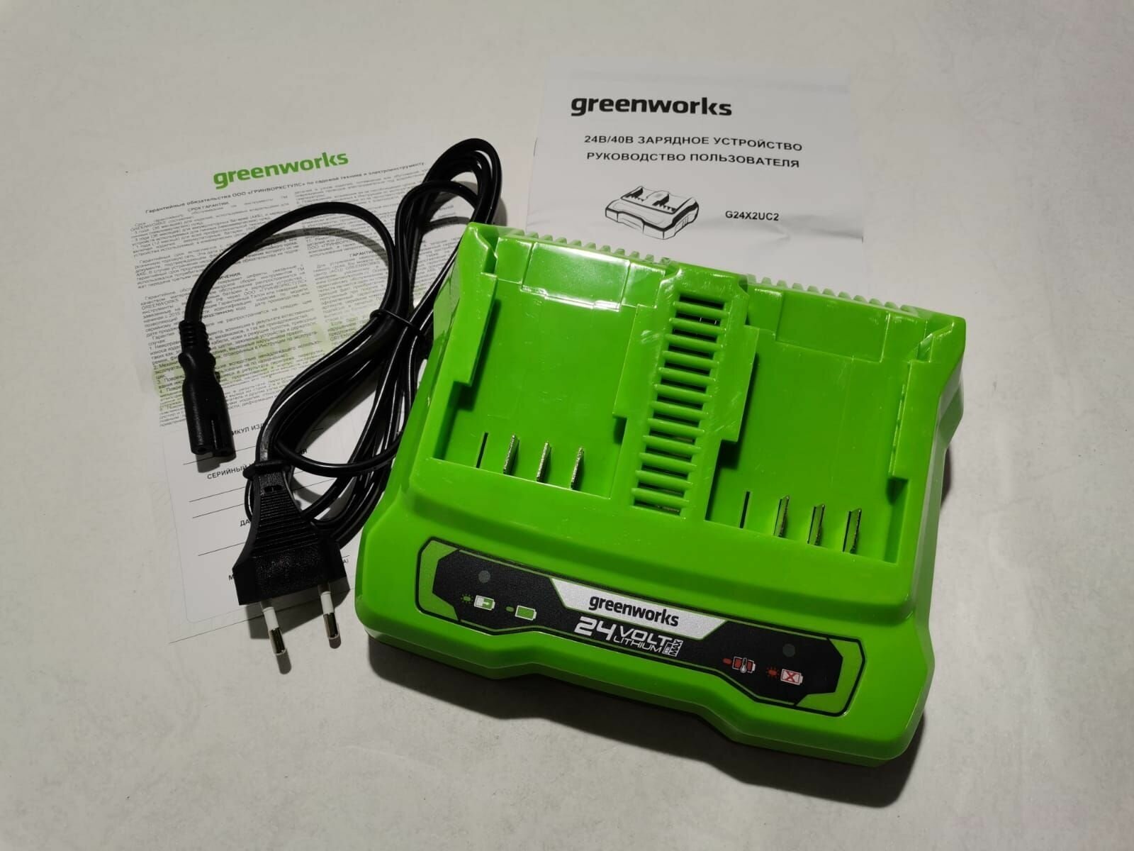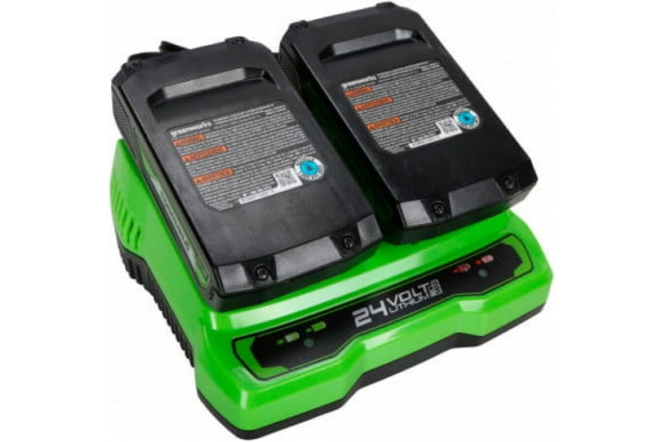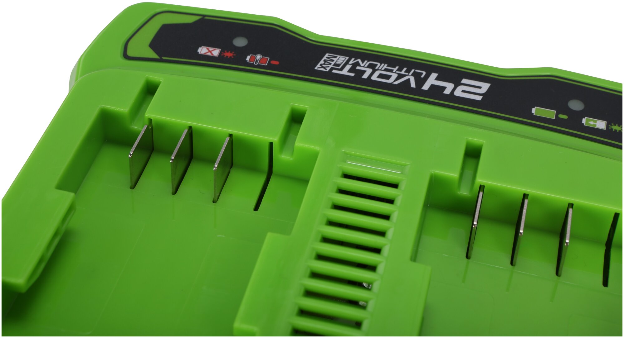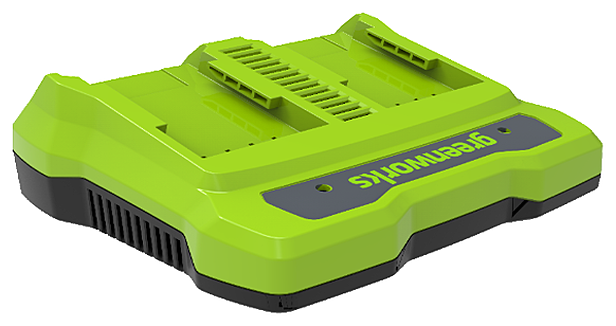 Зарядное устройство для двух литий-ионных аккумуляторов 24 В, 2 Ач Двойное зарядное устройство Greenworks G24X2UC2 24V 2Ah имеет встроенное охлаждение аккумулятора и светодиодный индикатор состояния заряда. Разработанный для использования в плоском или настенном исполнении, G24X2UC2 совместим со всеми батареями Greenworks на 24 В. Конструкция с двумя портами позволяет одновременно заряжать две батареи 24 В. Время зарядки 2 батарей G24B2 (24 В, 2 Ач) = 60 минут Время зарядки 2 батарей G24B4 (24 В, 4 Ач) = 120 минут Литий-ионная технология В аккумуляторах Greenworks используется новейшая литий-ионная технология для обеспечения оптимальной производительности. Преимущества включают быструю зарядку, длительное время работы и отсутствие саморазряда. Часть семейства 24V Зарядное устройство, входящее в семейство Greenworks 24V, совместимо со всеми аккумуляторами в линейке (G24B2 и G24B4). Индикатор уровня заряда Зарядное устройство оснащено встроенной светодиодной подсветкой, которая четко показывает состояние заряда. Выгоды Быстрая зарядка Заряжайте 2 батареи одновременно Светодиодный индикатор уровня заряда Система охлаждения АКБ Быстрый монтаж аккумулятора Используйте плоский или настенный Совместим со всеми аккумуляторами Greenworks 24 В Часть семейства Greenworks 24V Характеристики Тип аккумулятора: Li-ion Ёмкость, А. ч: 2 Напряжение (В): 24
